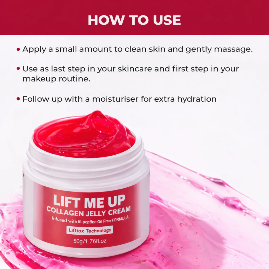 Experience a professional-grade lift without the needles—Lift Me Up Collagen Jelly Cream is an oil-free, fast-absorbing gel-cream powered by Liftox™ Technology to deliver instant tightening, firming, and contouring from the very first use. Formulated with Hydrolyzed Collagen, a 6-Peptide Complex, and Osilift™, this jelly cream visibly reduces sagging, smooths fine lines, and restores elasticity while providing lasting hydration. 92% of users felt instant firming and lifting—making it your go-to for a sculpted, youthful glow that fits seamlessly into your daily routine.